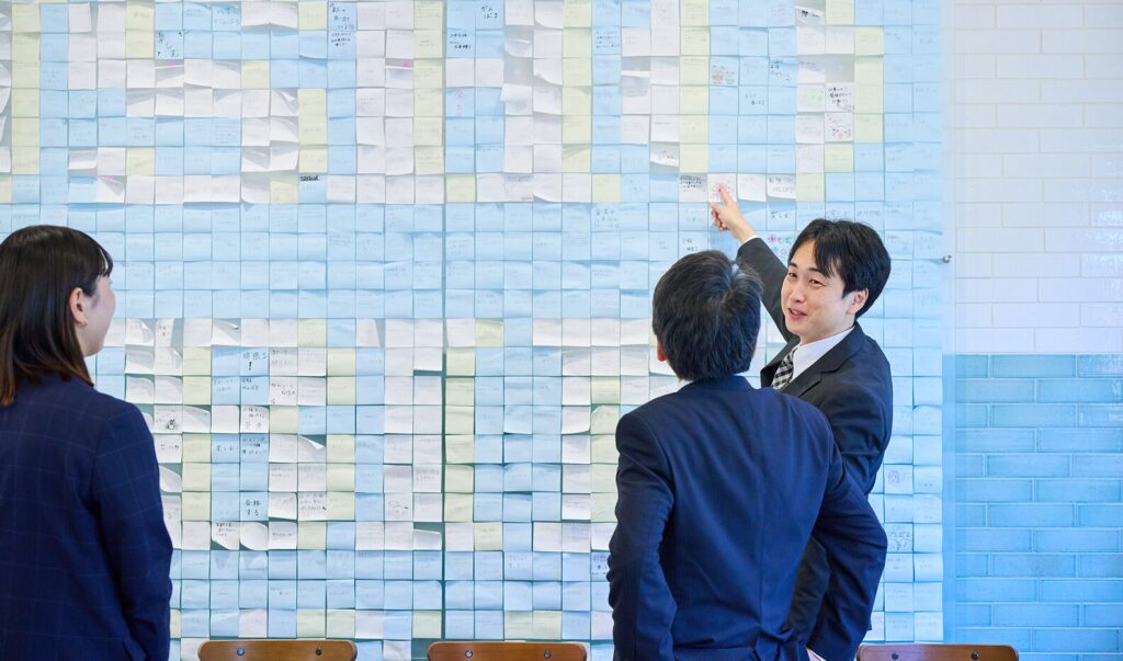 - ポストイットアートも生徒参加型の仕掛けの一つです。壁画などの案もありましたが、生徒さんが主体的に参加し、自由に活用してもらいたいとの想いから、自分たちでデザインを企画し、制作できるポストイットを採用しました。