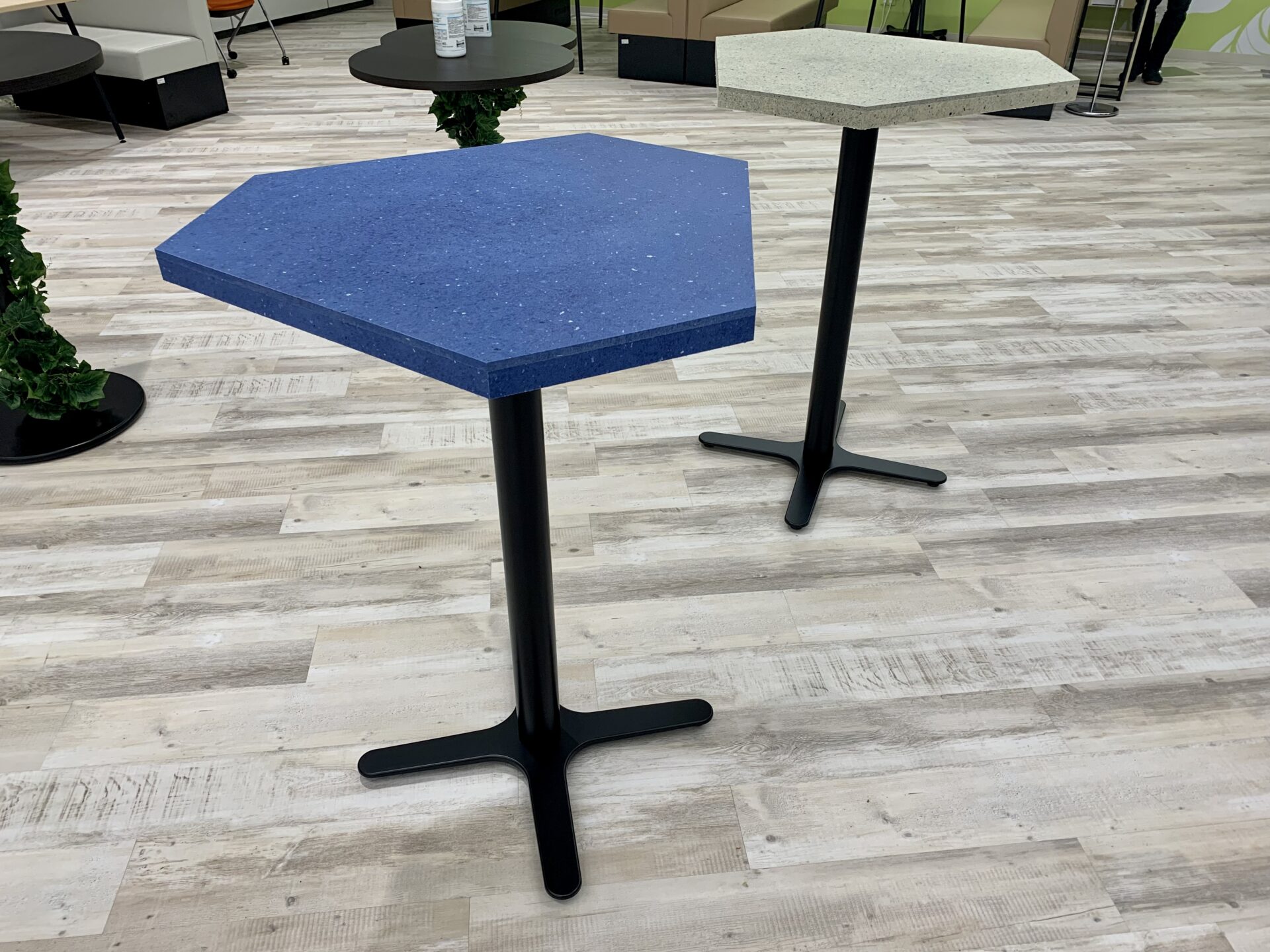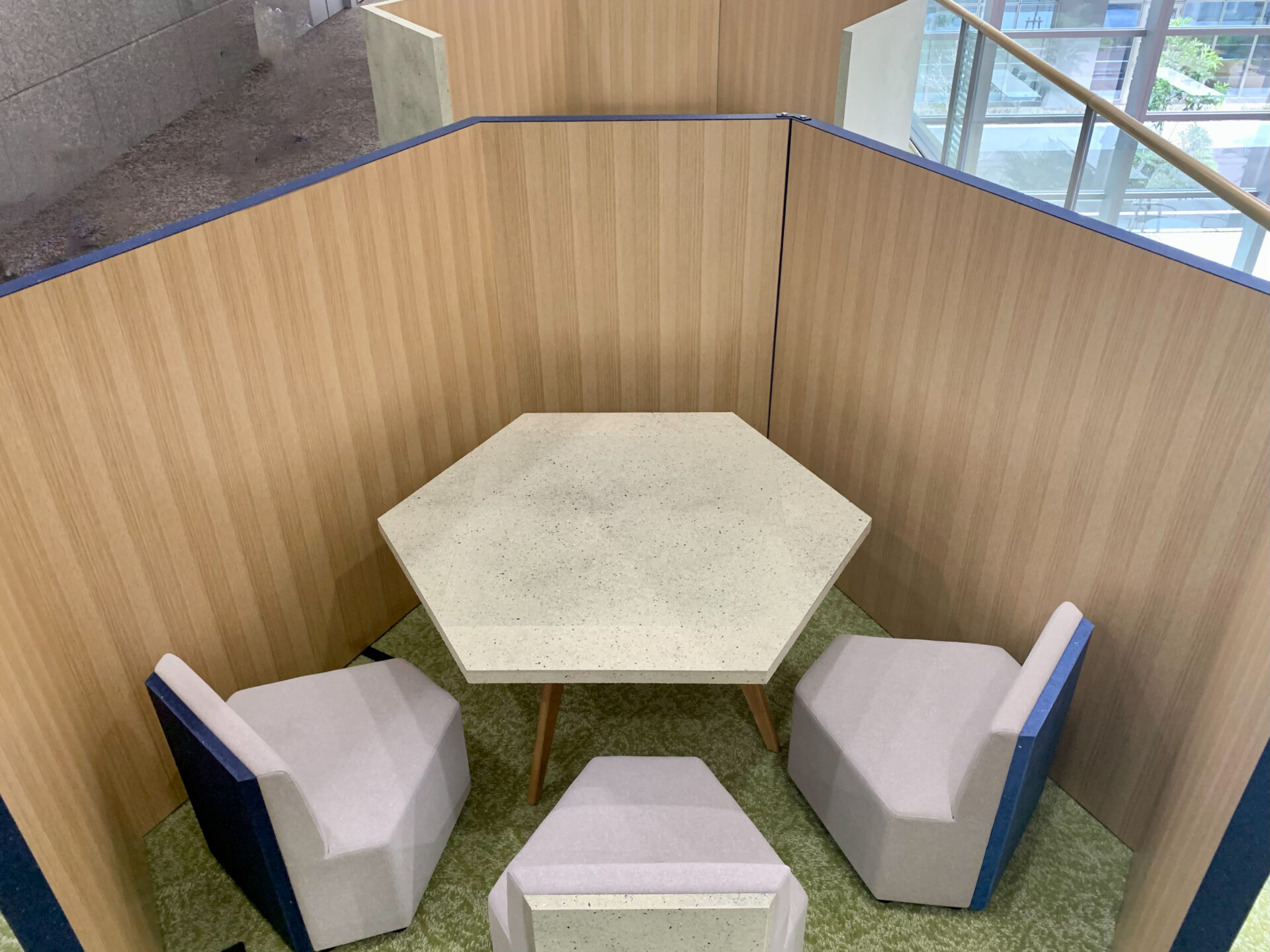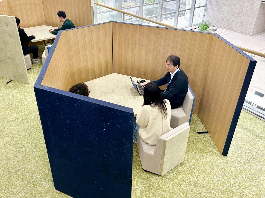 ・イスやテーブル、パーテーションの形はTDKの企業ロゴをモチーフに採用