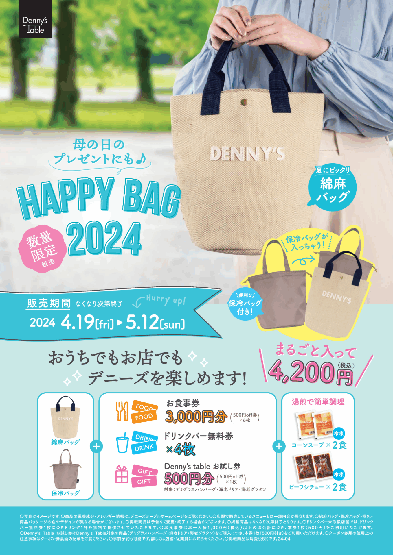 デニーズの特別企画 「HAPPY BAG 2024」の綿麻バッグと保冷バッグ、POPを製作 2024 年4 月19日(金)~5月12日(日)期間限定販売  販売に先立ち4月2日(火)よりデニーズ店舗で予約開始