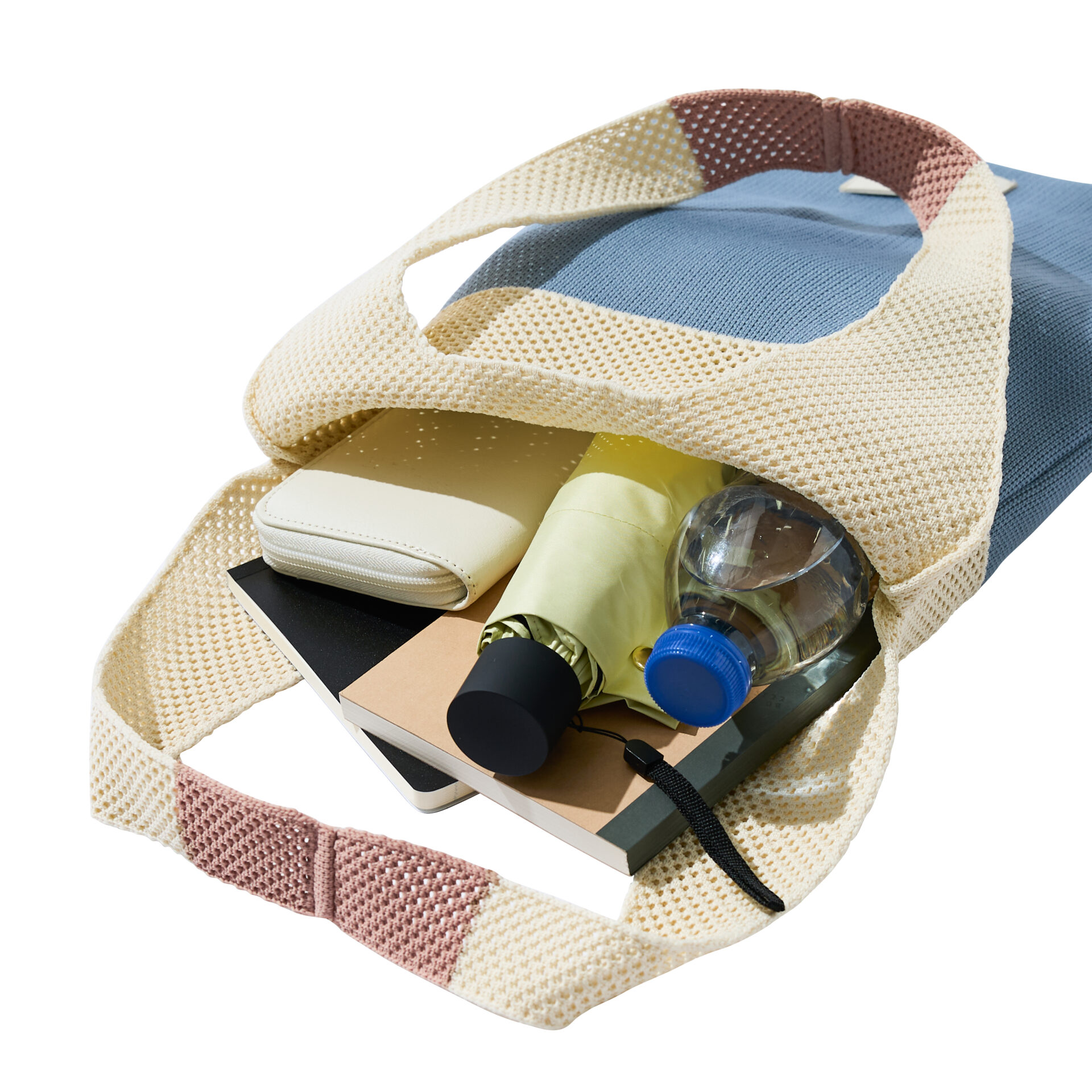 夏らしいカラーと素材感が特徴のニットバッグです。シンプルな装いに1点プラスするだけでポイントになるデザインで、A4サイズまで収納可能です。