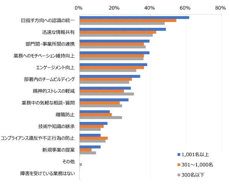 HR総研の調査によると、組織内のコミュニケーションについて、最優先して解決したいものは、すべての企業規模で「目指す方向への認識の統一」が最多となっています。