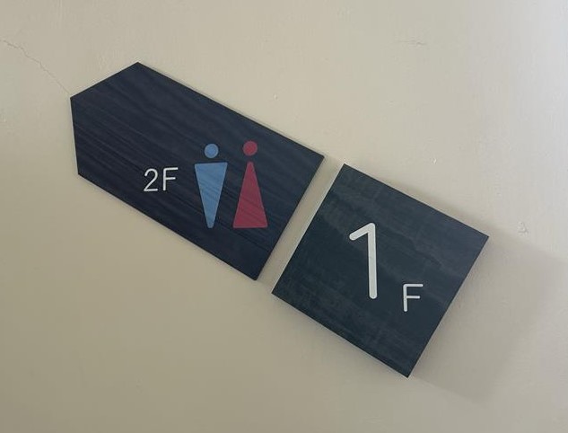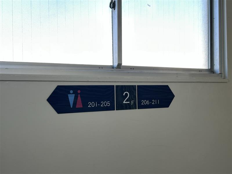 これまで、横浜創学館には廊下の階数表示や増築中の校舎におけるトイレのサインがなかったため、来校者にとってわかりづらいことが問題でした。要望も多かったため、廊下の階数表示とトイレのサインの製作にいたりました。