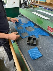 第1弾のルームシューズを製作する株式会社後藤(本社:山形県河北町 代表取締役社長:後藤 重美)で、シートカバーから型を切り抜いた後に残った「端切れ」から正方形を切り出します。