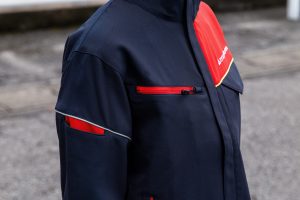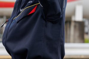 ユニフォームのカラーリングは、ミツウロコヴェッセルのコーポレートカラーの赤にダークネイビーを組み合わせ、上質感を追求しつつ汚れが目立ちにくくしました。胸元は切り替えを斜めに配し、スタイリッシュな印象に。ファスナーを裏使いすることで際立たせたファスナーテープの赤と、ゴールドパイピングをアクセントにしました。