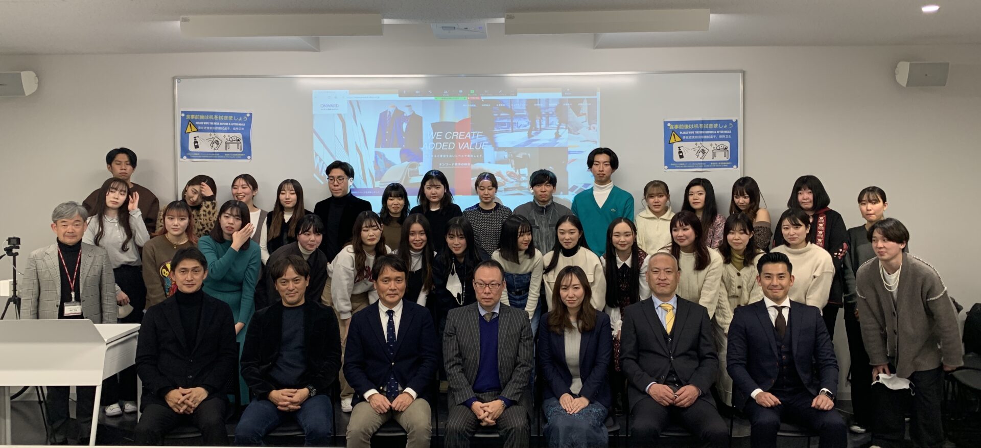 この寄付講座では『5~10年後に求められる新スクールアイテムを考える』をテーマとし、グループワークを中心にゼミナール形式での講義を行いました。オンワード商事のスタッフによる講義では、学生服業界やスクールアイテムの特徴、価格設定方法などの説明を行い、夏には代官山で開催したスクール展示会(https://onward-cd-renew.den-web.com/wp/news/399/)にも見学に来ていただきました。