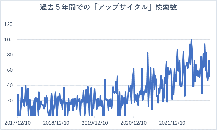 Googleでの「アップサイクル」検索数も直近5年で急伸しており、2022年は前年比1.54倍で検索数が増加しています。(データ:Googleトレンド)