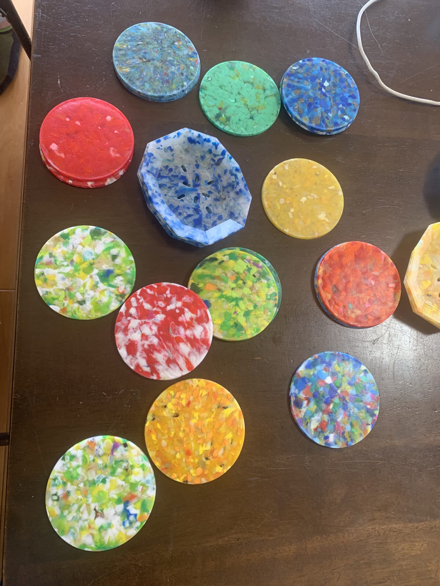 また、今回は、合同会社縄文企画(本社:沖縄県石垣市 代表:田中 秀典)の主宰するアップサイクルワークショップに参加し、本来捨てられてしまっていたペットボトルキャップを洗浄、粉砕、圧着し、カラフルなコースターを作製しました。今後は私たちの顧客企業に対しても、モノだけではなくこういった体験の提供を推進してまいります。