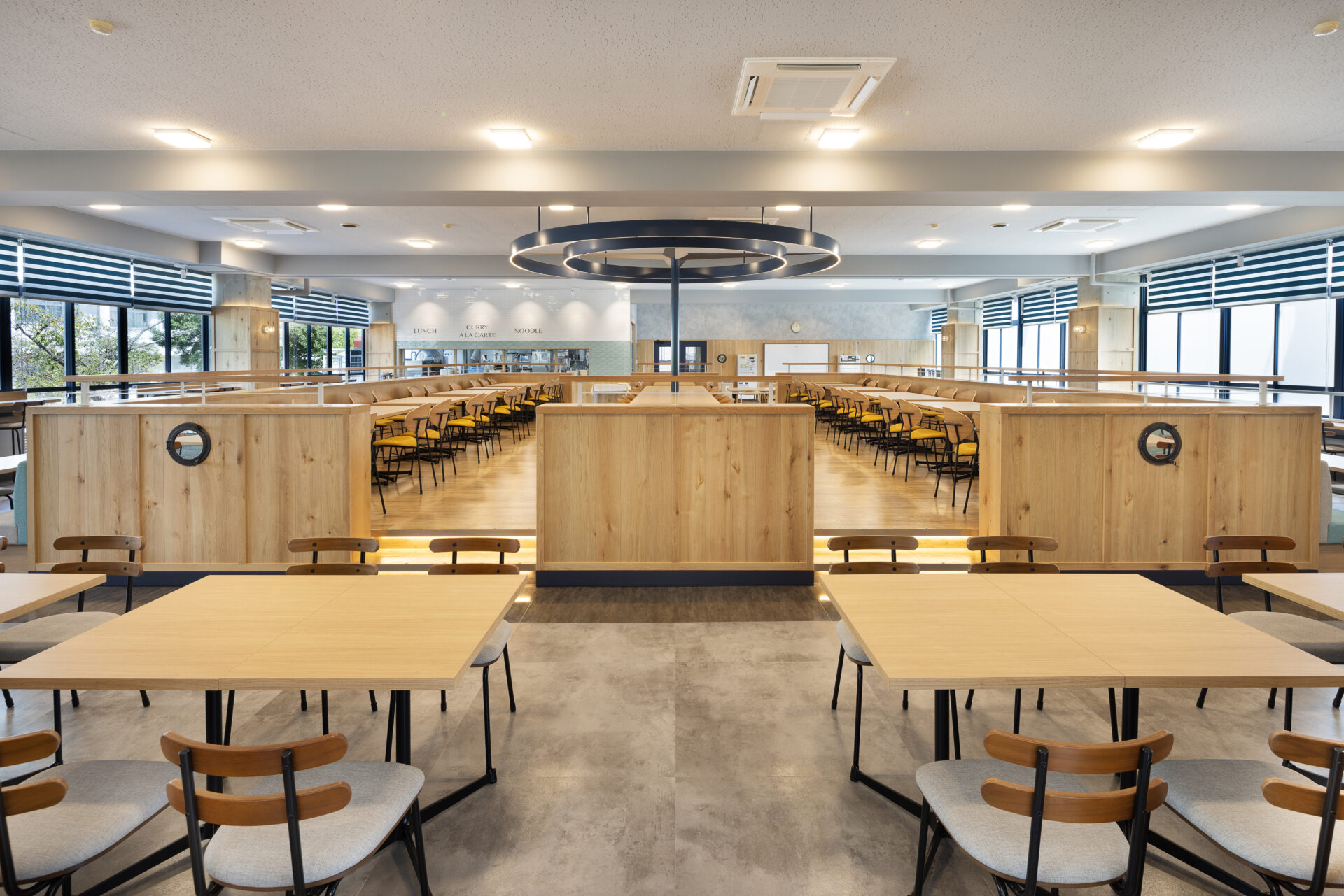 魅力ある学校づくりの一環として、食堂空間をリニューアルしました。ただ食事をするだけでなく、新たな学校の「顔」として親しまれる施設を目指し、生徒会と当社が共同で企画しました。